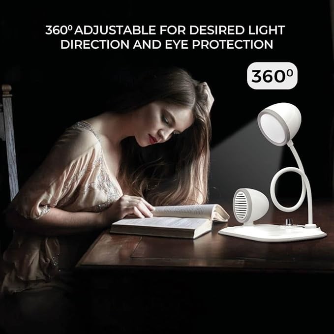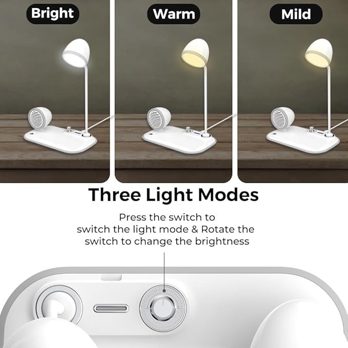 3 in 1 Desk Lamp with 15w Wireless Charger and Bluetooth Speaker & Mic for Calls | 360° Adjustable Lamp, 3 Color Lights, Brightness Control Button