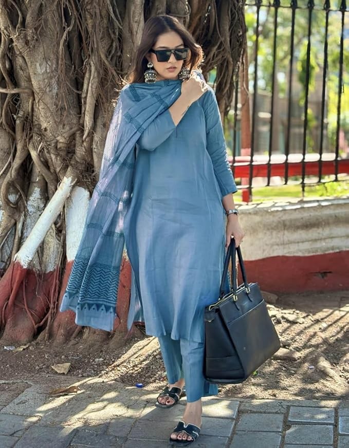 • This set includes: 1 Kurta and 1 Pant with Dupatta || Work :-Solid & Dupatta Printed || Neck Style:- V-Neck