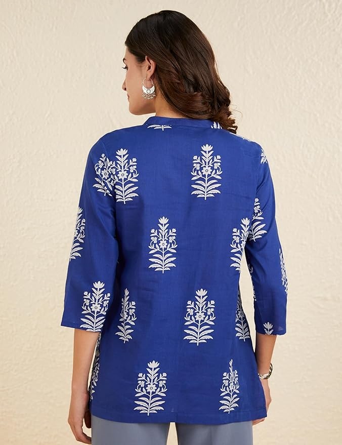 • PRODUCT DETAILS: A-line, screen printed, short kurti featuring pintucks at front yoke, band collar with half placket and 3/4th sleeves.