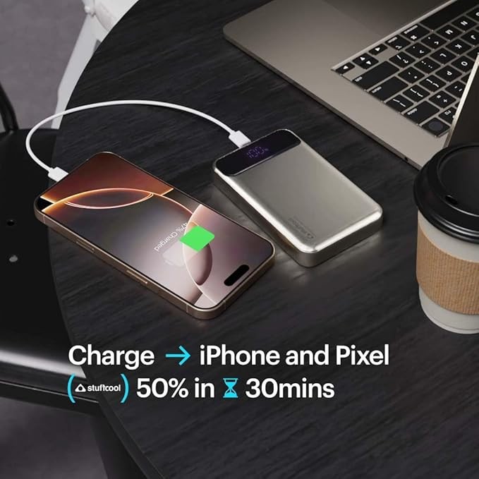 Stuffcool Click 10000mAh Slim Magnetic Wireless Powerbank Natural Titanium Finish Perfect for iPhone 16,15,14,13,12 with Led Display and 20W Fast Wired Charging - Charges iPhone 50% in 30 mins