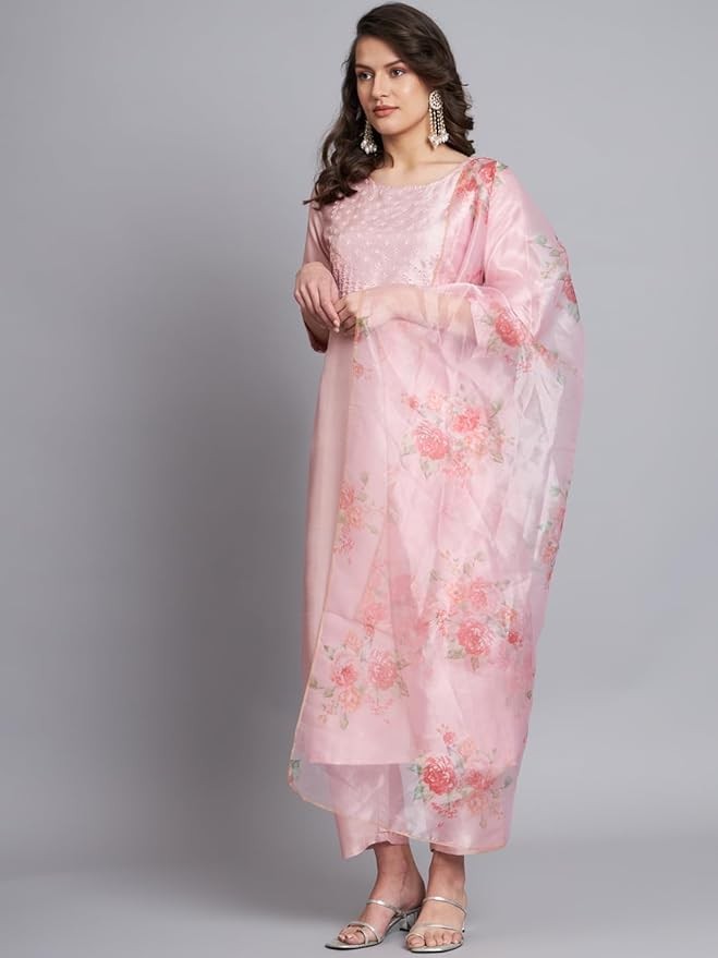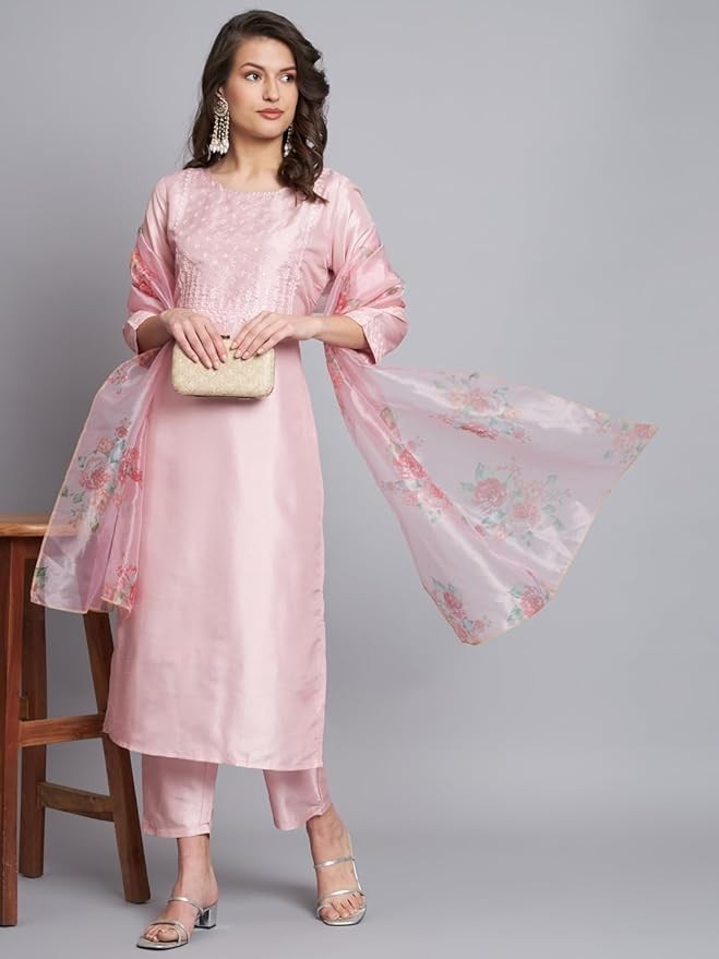 Women's Silk Blend Embroidered Straight Kurta Pant Set with Organza Dupatta